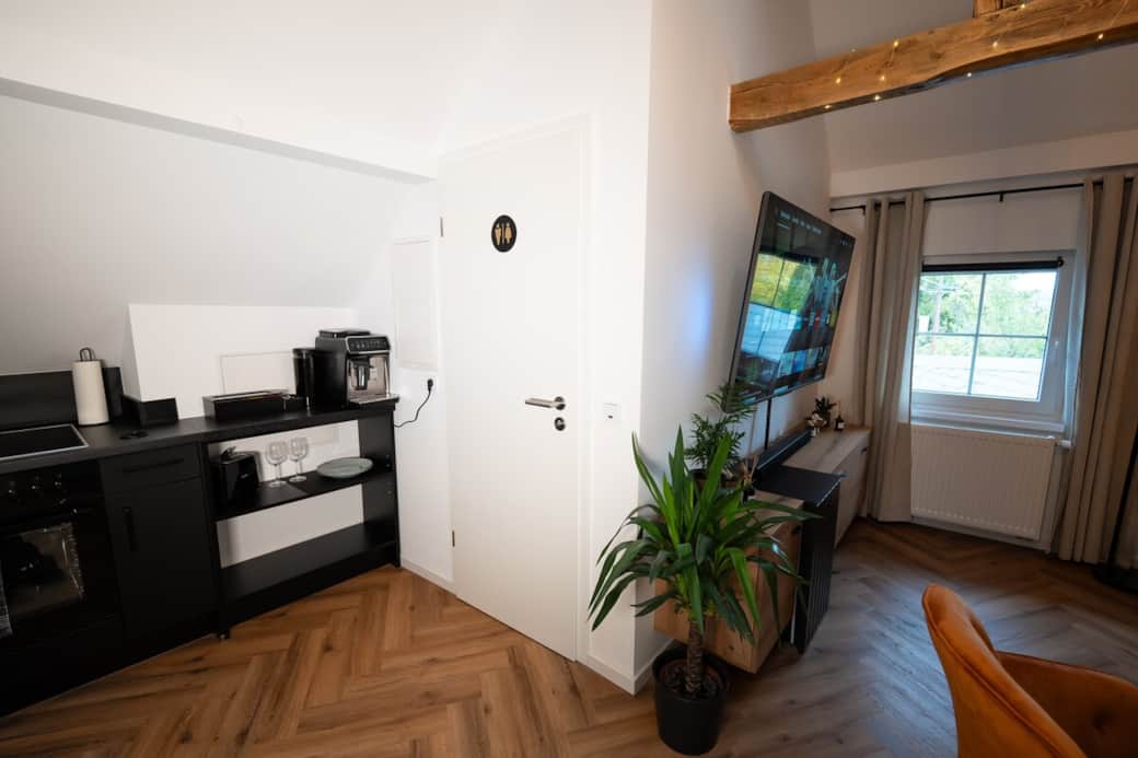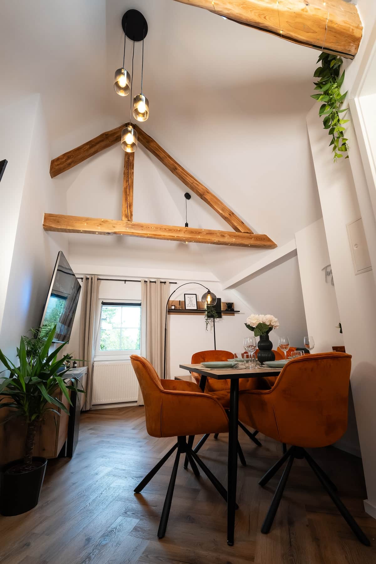 Stilvolles Premium-Apartment mit Smart-TV, Soundbar, voll ausgestatteter Küche, Ankleide & großem Esstisch.